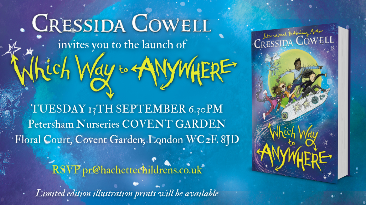 It was fabulous to be at the launch of Cressida Cowell’s latest book, ‘Which Way to Anywhere‘ a while back (I’ve been behind with my site admin duties lately!!). In a funny and moving speech it was lovely to hear the story behind the story, where this book came from an idea that began 25 years ago. So cling onto those ideas, people!! Cressida was so generous with her time and it was great to have a chat her and my headteacher wife about the importance of reading for pleasure and all the good work that teaching staff do in schools.