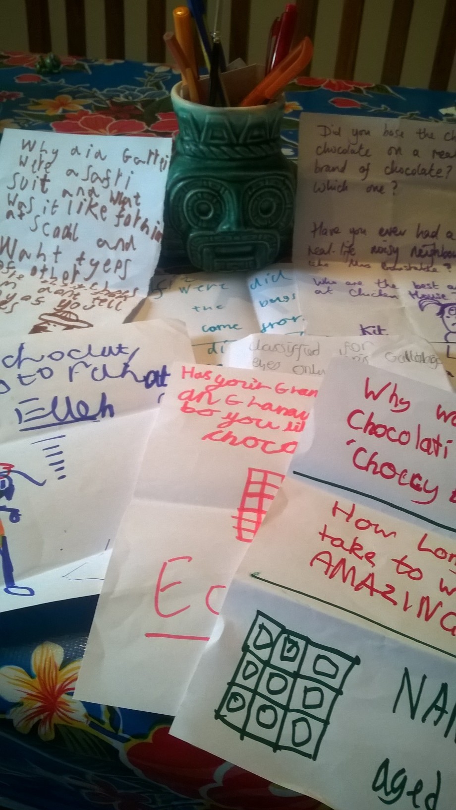 We have some questions for you, from our recent book club meet at The Suffolk Anthology, Cheltenham. Love for the Chocoplot was unanimous and we all enjoyed its humour and language play- like the alliteration and neologisms. A favourite part was when Jelly and her Gran were in the ball pit, trying to escape. Dodgy Dave had his mention, too!